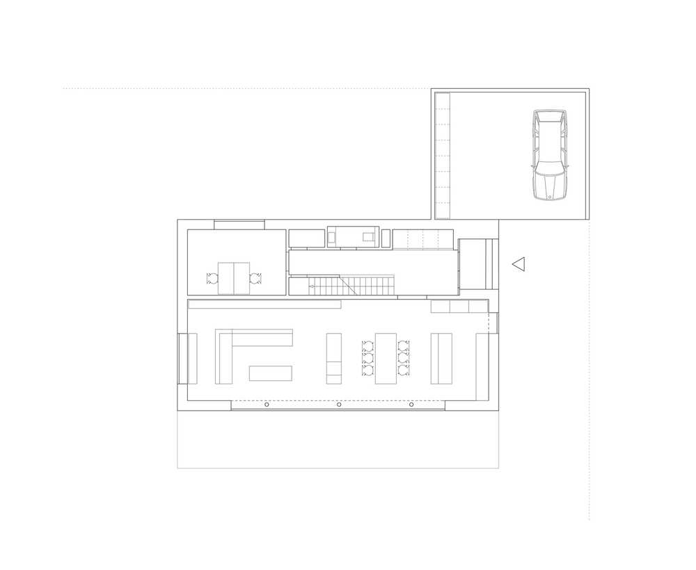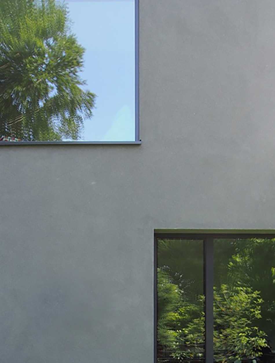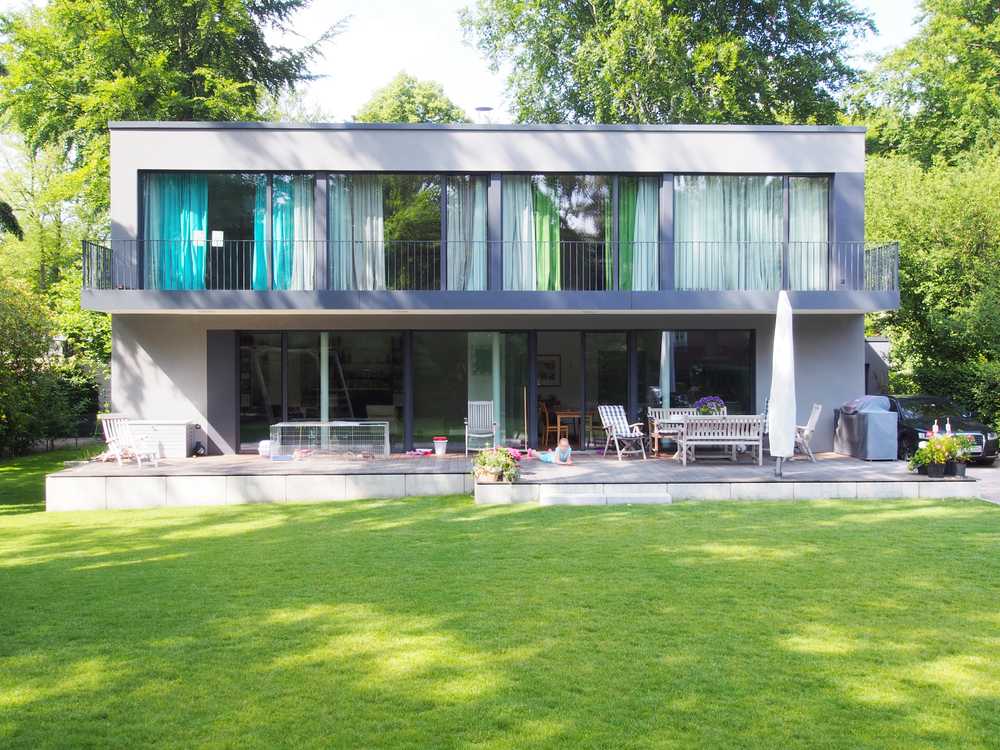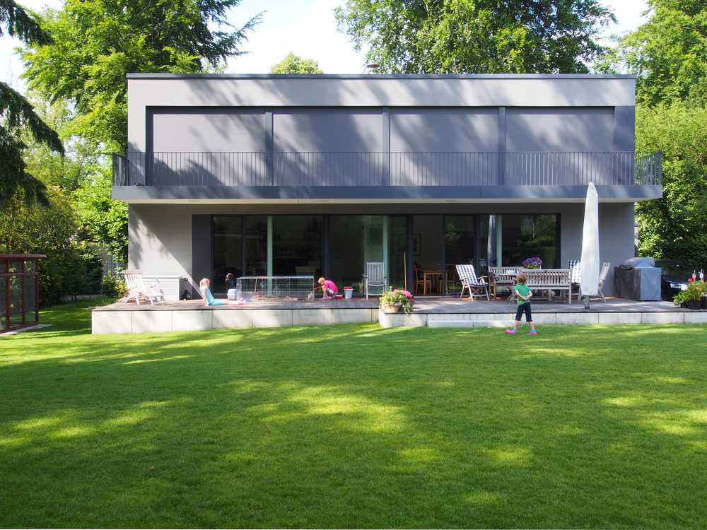 Das für eine fünfköpfige Familie geplante Einfamilienhaus befindet sich am Rande eines durch große, parkartige Gartengrundstücke geprägten Villengebietes im Hamburger Westen. Der zweigeschossige, kubische Baukörper passt sich in die Reihe der Nachbargebäude ein und besetzt so den rückwärtigen Teil des großzügigen Grundstückes. Dreiseitig relativ geschlossen und auf einzelne akzentuierte Blicke beschränkt, öffnet sich im Süden das Haus fast vollständig zum Garten. Im Erdgeschoss erstreckt sich der Raum für Wohnen, Kochen und Essen über die gesamte Breite des Baukörpers. Dieser ist nur durch einen frei stehenden Kamin gegliedert. Es entsteht der Eindruck einer nach Süden zum Garten hin geöffneten Halle, Garten und Gebäude verschränken sich zu einer Einheit. Der im rückwärtigen Teil gelegene Erschließungsbereich verbindet das Erdgeschoss mit den Individualräumen im Obergeschoss. Ein grauer, durchgefärbter, mineralischer Kratzputz und die dunklen großformatigen Metallfenster verleihen dem Haus einen eigenständigen Charakter und heben den Baukörper deutlich von seiner natürlichen, grünen Umgebung ab.