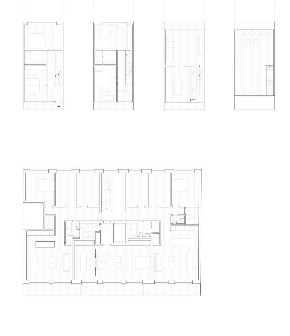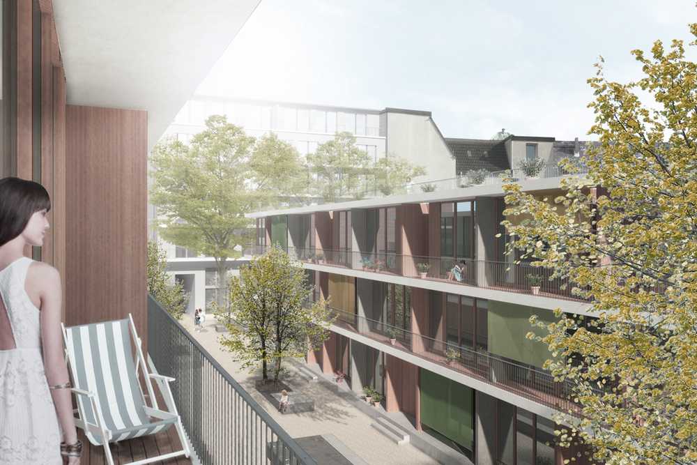 Das in Hamburg-Eimsbüttel geplante Gebäudeensemble stellt eine Weiterentwicklung der für Hamburg typischen, historischen Form der Hinterhausbebauung (Terrassengebäude) dar. Während das neue Vorderhaus die Blockkante schließt und sich in Traufhöhe und Gestaltung an den Nachbargebäuden orientiert werden im hinteren Grundstücksteil zwei dreigeschossige, sich gegenüber stehende, spiegelsymmetrische Zeilen errichtet. Im Vorderhaus sind im Erdgeschoss Ladenlokale, in den Obergeschossen Zwei- und Vierzimmerwohnungen vorgesehen. Im Bereich der Hinterhausbebauung sind anders als im historischen Vorbild dreigeschossige Maisonettewohnungen mit großer Dachterrasse geplant um ein familiengerechtes Wohnen mitten in der Stadt zu ermöglichen. Jede Wohnung verfügt auch über einen kleinen Garten im Erdgeschoss und einen direkten Zugang zur Tiefgarage. Der Hof bleibt autofrei.