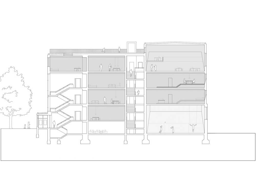 Im Vordergrund unserer Planungen steht dabei die Frage, in welcher Weise das Gebäude nicht nur in seiner äußeren Erscheinung, sondern auch in seiner inneren Struktur und Ausstattung so weit wie möglich erhalten und trotzdem weiterentwickelt werden kann. So soll die Wohnnutzung fast ausschließlich innerhalb der ehemaligen Klassenräume stattfinden. Auf Balkone wurde zugunsten einer Wiederherstellung der von Gustav Oelsner geplanten Freiluftklasse auf dem Dach verzichtet. Turnhalle, Aula, Treppenräume und Flure sollen in ihrer ursprünglichen Form und Ausstattung erhalten bleiben.